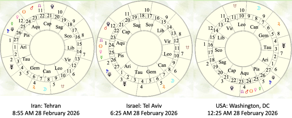 All three nations share the same sky on February 28, 2026. One of the most striking parts of the charts is the the four-planet combination in Aquarius — Sun and Rahu in near-exact eclipse conjunction, Venus and Mercury retrograde conjunct within one arc minute – and flanked by exalted Mars conjunct Pluto in Capricorn and an exact Saturn/Neptune conjunction in Pisces. Each of the the three nation’s individual perspective is reflected by the different local time at which war began, ie the chart Ascendant (rising sign) – the determinant of the astrological houses for that chart.